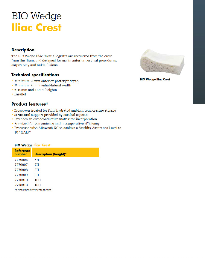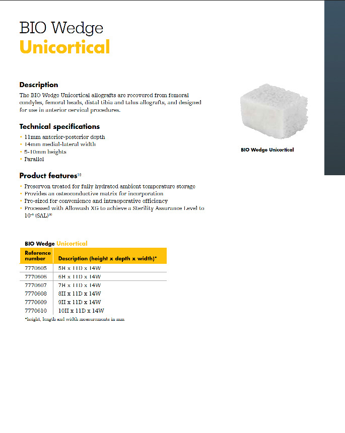 The BIO Wedge class of allograft materials has 3 different options and is intended to be utilized in anterior cervical or corpectomy cases. All stored at room temp