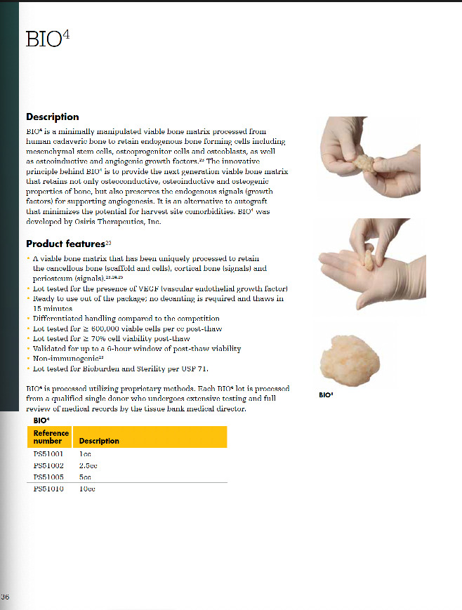 The BIO4 is a viable cellular allograft with mesenchymal stem cells, osteoprogenitor cells and osteoblasts contained with the cortico-cancellous and collagen scaffolding materials required for bone growth.