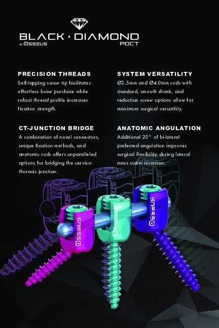 The Black Diamond POCT Posterior Occipital-Cervical-Thoracic fusion system by Osseus is a flexible posterior fusion system spanning from the occiput to the thoracic spine and is fully integrated with the Black Diamond Thoracolumbar-sacral pedicle screw system. The Black Diamond POCT features an occipital plate and high angulation screws for optimal fixation across the cervical spine.