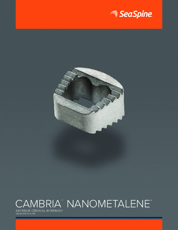 The Cambria NanoMetalene is a titanium coated PEEK ACDF spacer that has a 1-micron thick bonded layer to the PEEK. Comes as cage only, requires supplemental fixation.