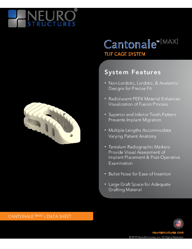The Cantonale[MAX] TLIF interbody spacer designed by NeuroStructures/NuGen, consists of porous titanium in a trabecular structure to promote multi-axial bone ingrowth and increase long-term fixation. The bulleted nose is for ease of insertion, superior and inferior tooth pattern to prevent migration, and is available in multiple lengths to accommodate varying patient anatomy.