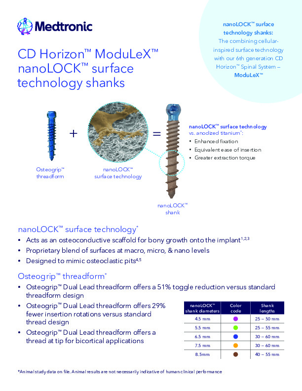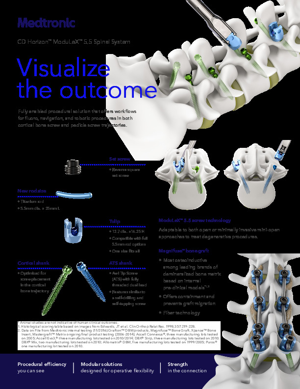 The CD Horizon ModuLeX 5.5 Spinal system by Medtronic is a complete thoracolumbar fixation system using the 5.5mm rod system. It features pedicle screws for use in the traditional pedicle screw as well as the medial cortical screw. In addition If features the option for Osteogrip threadform which has a cortical and cancellous thread.