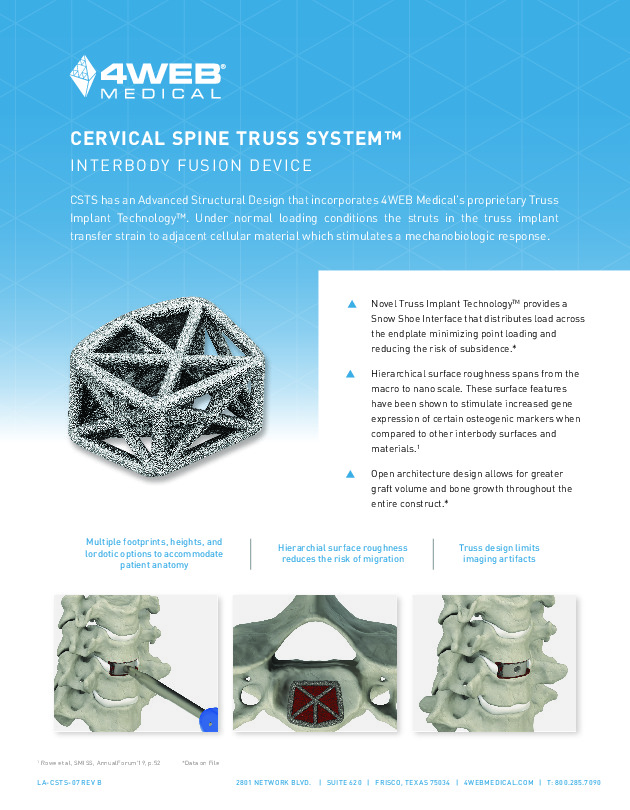 The Cervical Spine Truss System is a 3D printed titanium ACDF spacer with plasma sprayed titanium coating. The Truss system is an open architecture design with load sharing properties for load distribution.