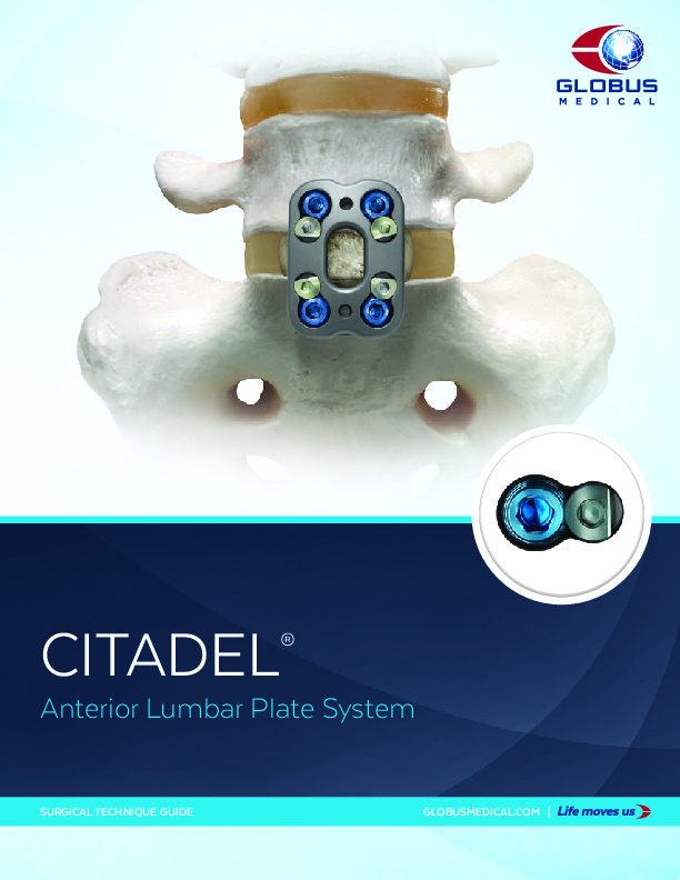 The CITADEL is an Anterior Lumbar plate system by Globus Medical that is made in titanium and offers 1 and two level plate options with special plates for use with the sacral anatomy. Multiple size options from 20-99mm length in the single and 2 level options. Locking screws with variable angle, self tapping thread.