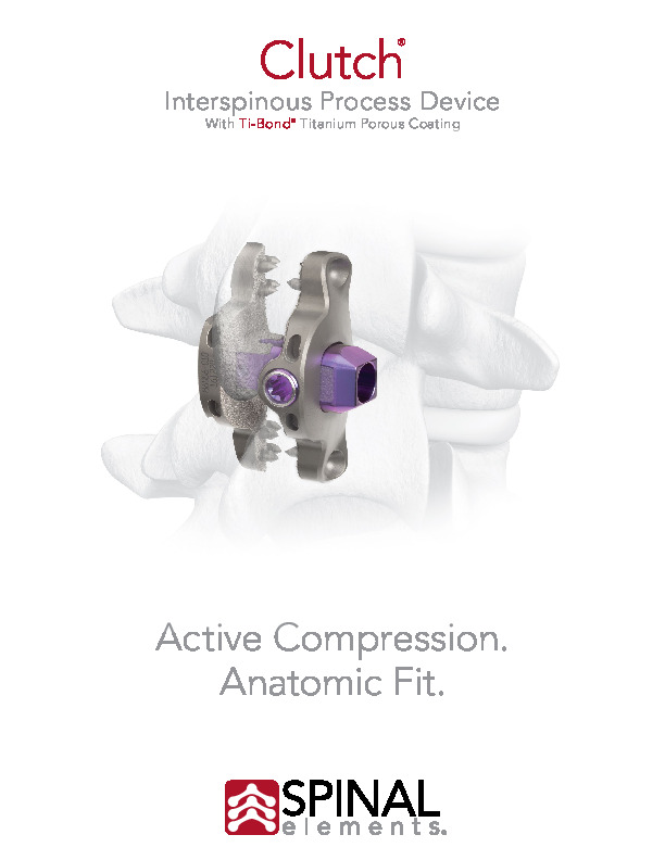The Clutch Posterior Fixation System by Spinal Elements is an interspinous process fixation clamp for use as an alternative to pedicle screw fixation. It features Active Compression Technology (ACT) to maintain active compression agains the bone using a spring-activated mechanism. In addition, it features a porous titanium coating Ti-Bond, which increases bony ingrowth