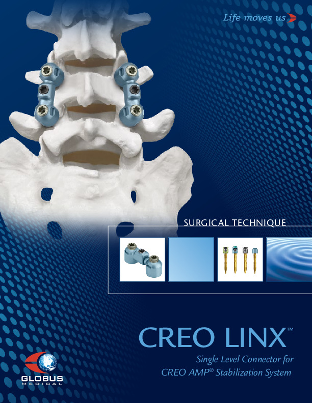 The CREO LINX is a single level modular pedicle screw post connector for use with the CREO AMP system. It is an implant that locks to the modular post that replaces the rod and caps used in traditional fixation methods. The system translates to accomodate several mm of translation.