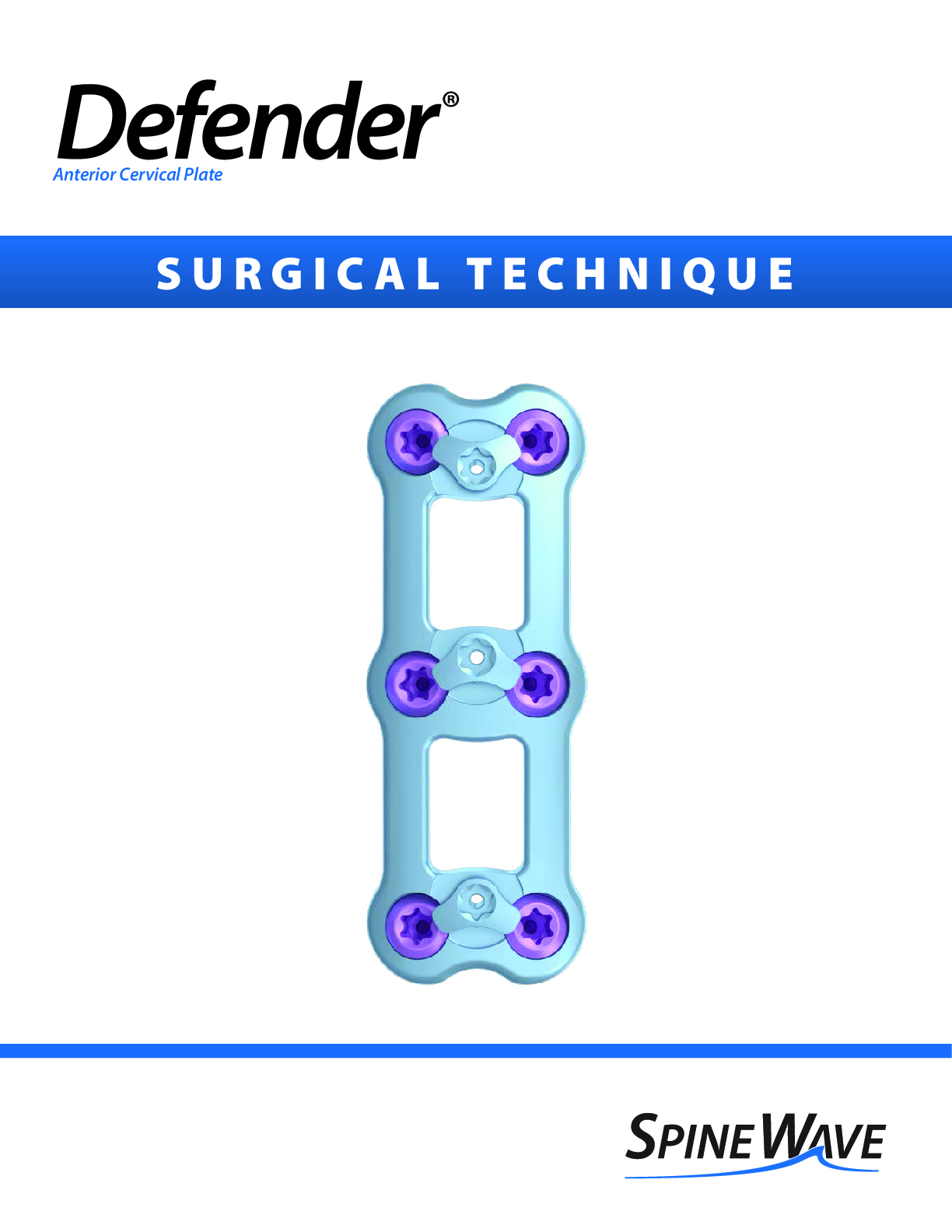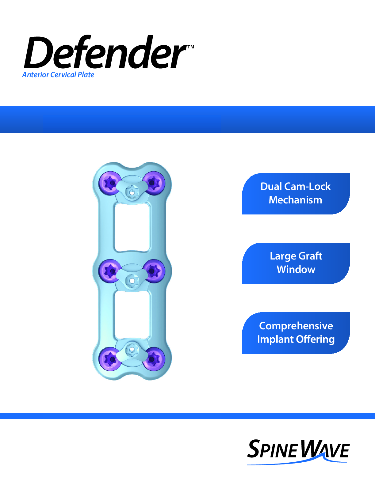 Defender ACP by Spine Wave is a low profile anterior cervical plate with a dual cam-lock mechanism designed to secure both screws at the same vertebral level in one step utilizing the same driver. Screws feature a dual-lead thread design and hexalobe interface, are offered in 4.0 and 4.25 diameters, and lengths ranging from 10-22 mm. Screw types include self-drilling, self-tapping, fixed and variable angle. Plates are 2.2 mm thick x 16.5 mm wide, and come in lengths ranging from single level 8 mm hole-to-hole and up to 5 level as long as 91 mm, have smooth tapered edges, large graft window design, and are curved in both the axial and sagittal planes.