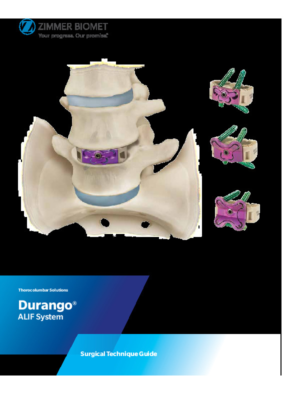 The Durango ALIF System by Zimmer-Biomet was acquired by Highridge Medical in 2024. The system is designed for standalone fixation using a modular PEEK spacer and a 0-profile titanium plate with 4 hole fixation. The screw are retained by a locking anterior plate to prevent screw migration.