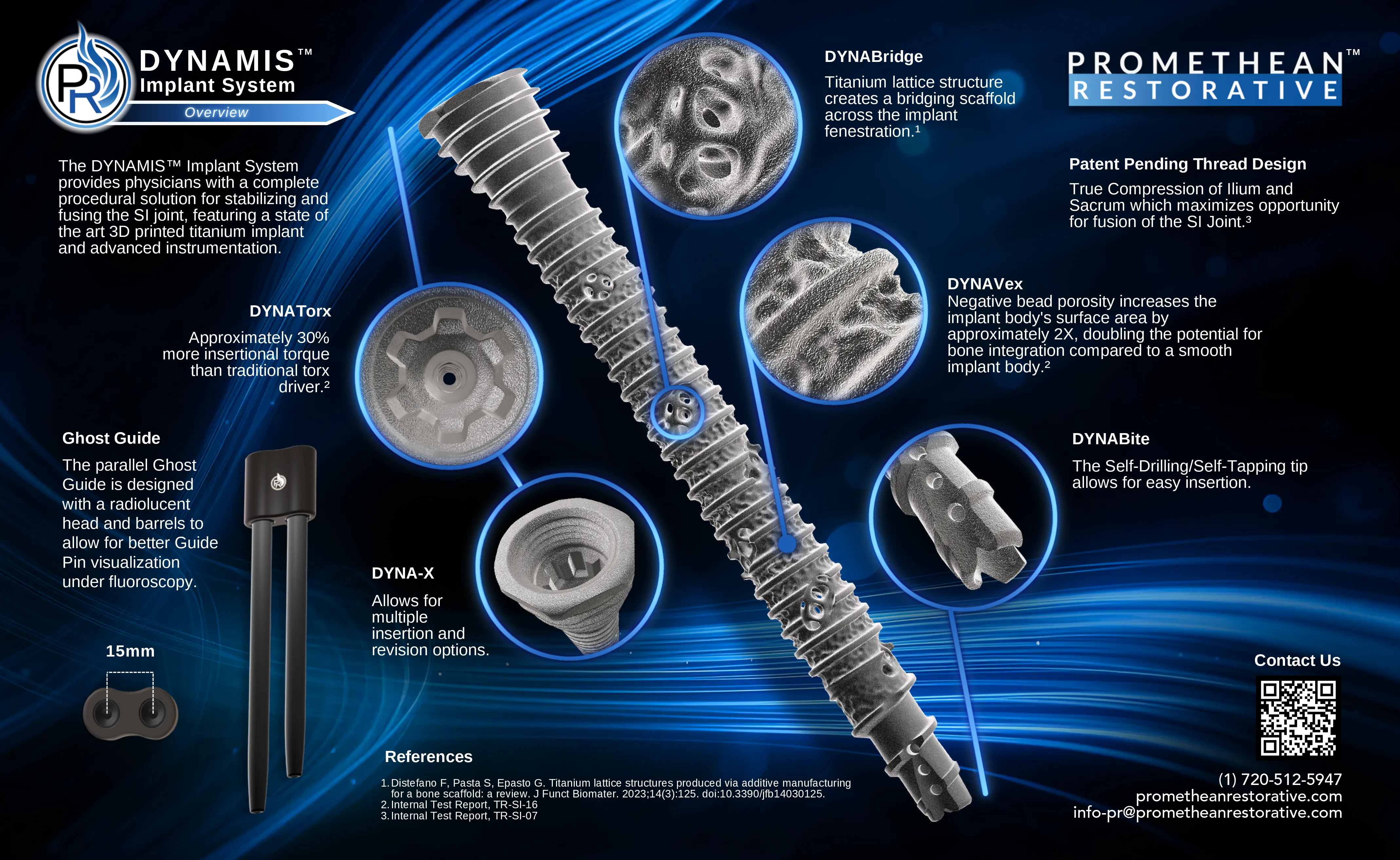 The DYNAMIS Sacro-iliac Joint fixation system by Promethean Restorative is a 3D printed titanium implant system for use in the MIS Lateral fixation of the SI joint. It is composed of 3D printed titanium with DYNABridge 3D lattice structrure which allows for bony ingrowth along the screw. The tip is a self-drilling, self-tapping screw. The thread design allows for compression at the head. The screw is cannulated for use with guide wire and the system featrues a Ghost Guide that allows optimal spacing between the screws.