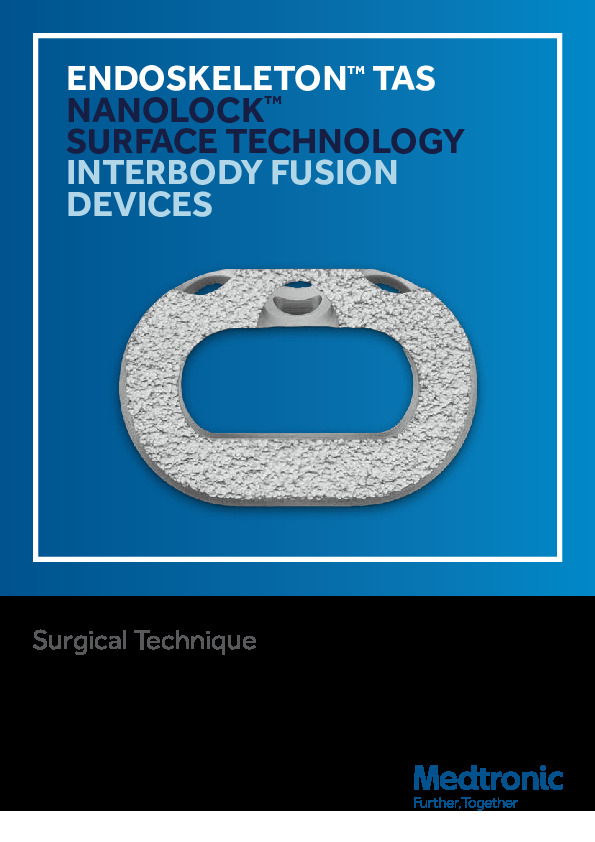 The Titan Spine Endoskeleton TAS which was acquired by Medtronic in 2019 features a titanium structure with nanoLOCK roughened surface treatment producing nano structures for bony integration. It features integrated screw fixation