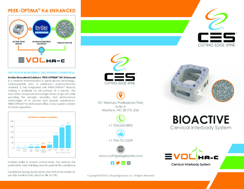 EVOL HA-C by Cutting Edge Spine is an ACDF implant made of PEEK-OPTIMA HA Enhanced polymer. This innovative compound of PEEK-OPTIMA Natural and fully integrated hydroxyapatite (HA) encourages bone on-growth while providing the strength versatility, and performance of PEEK.