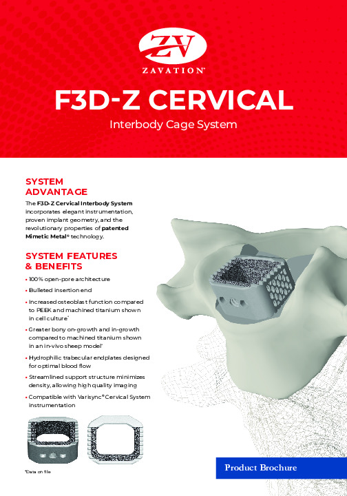 The F3D-Z is a 3D printed titanium ACDF spacer using patented Mimetic Metal technology and features an open architecture with 3D trabecular surfaces for improved bony ingrowth.