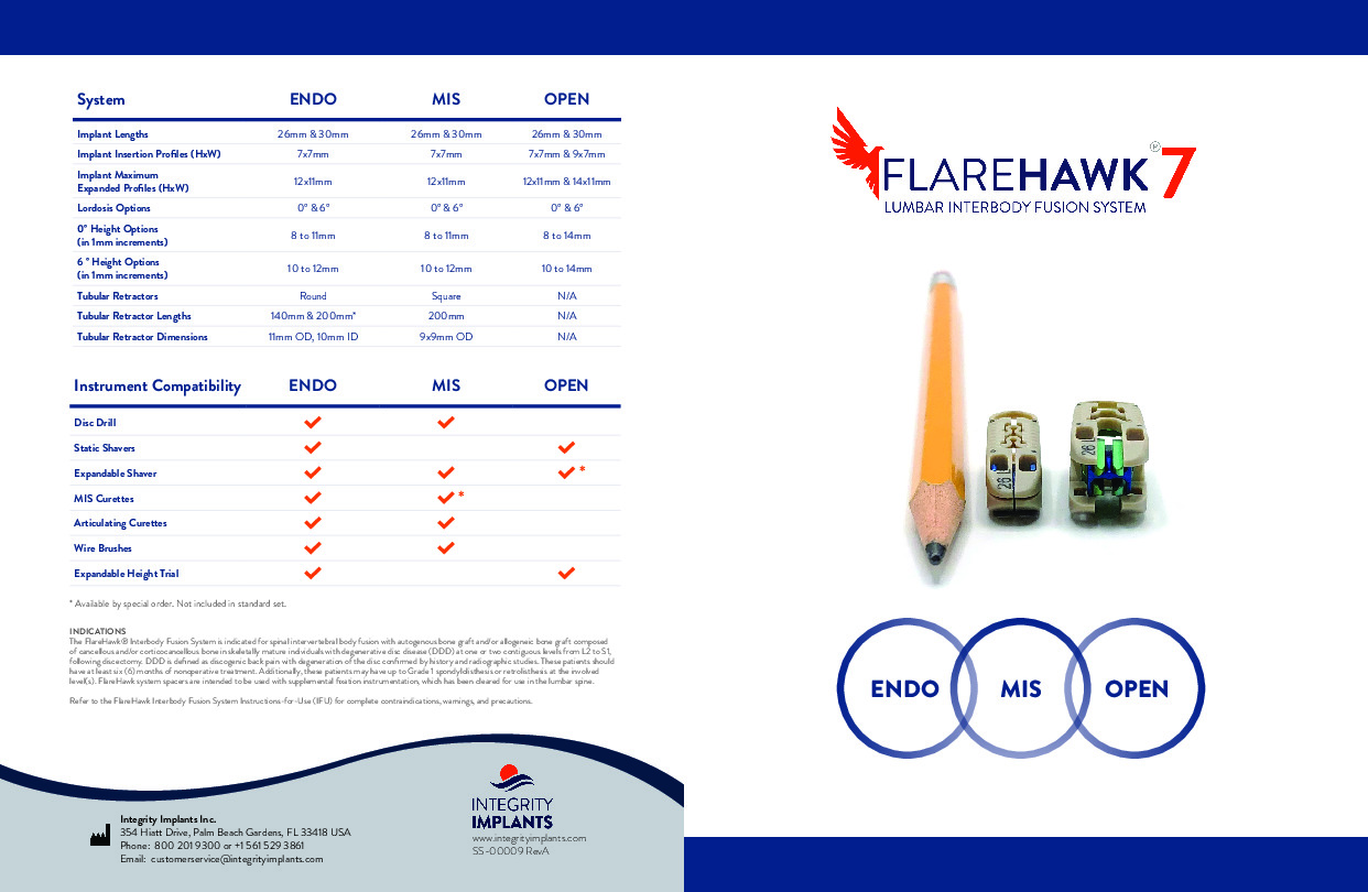 The FLAREHAWK & TiHAWK is a Bi-directional expandable spacer for use in the PLIF and TLIF procedure as well as the endoscopic or extraforaminal Kambin's triangle approach. The technology uses a PEEK outer shell that is pushed outwards in both height and width with expansion of the inner titanium drive mechanism. This allows for a minimal footprint insertion size with up to a 55% increase in footprint size after expansion. Useful in endoscopic procedures where minimal footprint required for cage placement or in standard TLIF and PLIF approaches. The cages come in both PEEK outer shell and a titanium bonded coating to the PEEK shell. The FlareHawk7 (represents the width of the non-expanded implant, where 7 is 7mm width, 9 is 9mm width, and 11 is 11mm width). The FlareHawk9 and FlareHawk11 share the same inserter and instruments where the FlareHawk7 uses separate instruments and is more suited for the endoscopic approach.