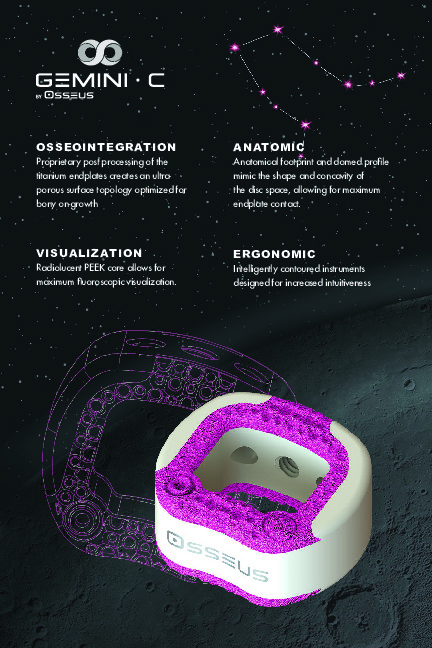 The Gemini-C by Osseus is a hybrid anterior cervical interbody fusion spacer that combines proprietary etched porous titanium endplates and the benefits of radiolucent PEEK body. The shape of the spacer mimics the endplates for better bony apposition and combined with the porous surface structure of the etched titanium increases osseointegration.