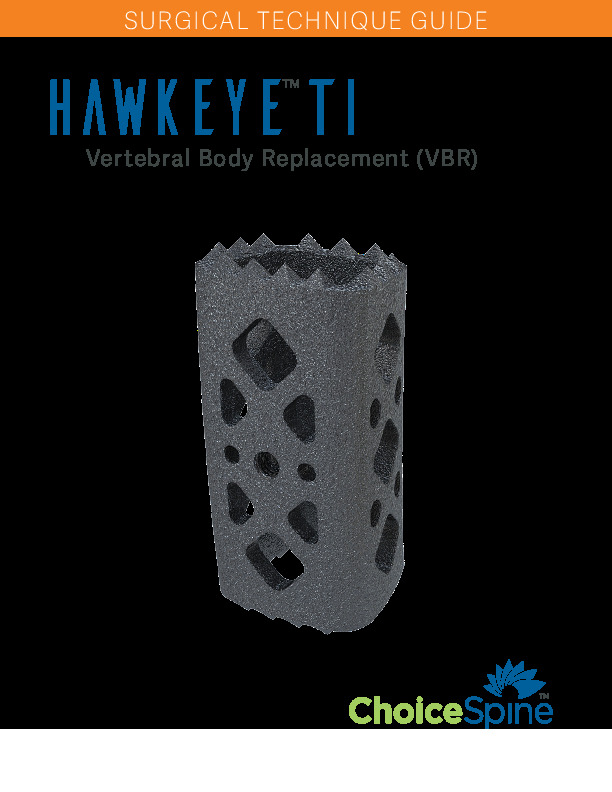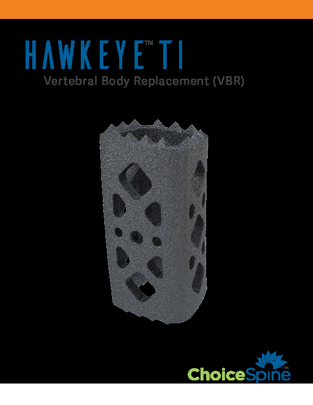 The HAWKEYE Ti Cervical and Thoracolumbar Corpectomy System by Choice Spine is a vertebral body replacement spacer for use in the corpectomy procedure. HAWKEYE Ti is available in 2 footprint options and has a large central graft window for packing of bone graft material. The spacer has an 8 degree endplate lordosis. Requires supplemental fixation