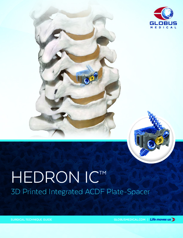 The HEDRON IC is an 3D printed titanium anterior cervical discectomy and fusion (ACDF) spacer by Globus which is intended to be assembled with the Globus COALITION AGX plate. The cage is meant to be a stand alone ACDF spacer. The HEDRON cage is 3D printed titanium which allows for bony ingrowth. The large inner lumen of the spacer allows for a larger volume of bone graft to be placed.