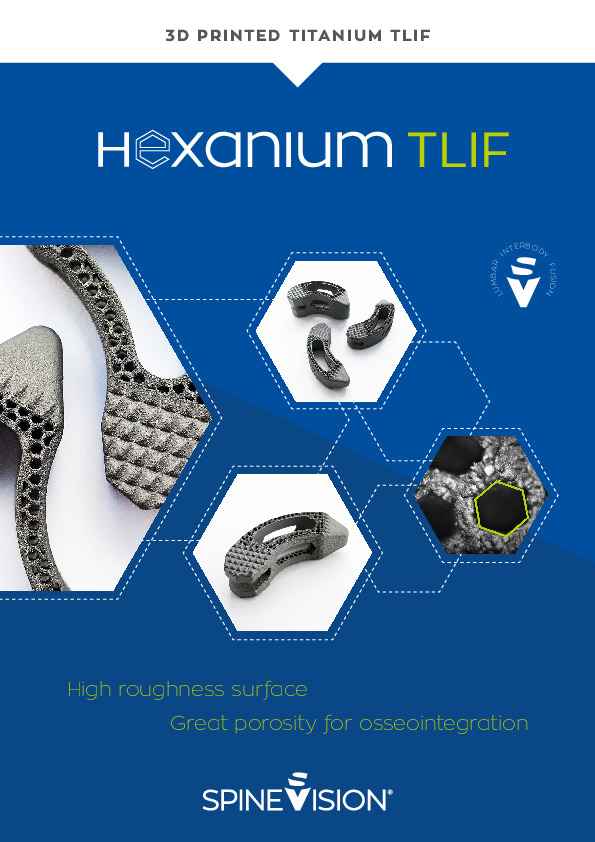 The Hexanium TLIF Cage by SPINEVISION is a 3D printed titanium curved interbody fusion system with honeycomb structure, high porosity, rough surface, large visualization windows, and osteoconductive design for optimal bone ingrowth and reduced subsidence risk. It is intended for use in the TLIF procedure.