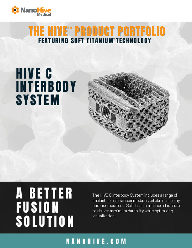 The HIVE C Cervical Interbody System by NanoHive is a unique solution for fixation in the ACDF procedure. The spacer features a unique internal architecture that allows independent endplates that reduces device stiffness and allows new bone growth to be under load. The 3D printed titanium spacer is also treated with Acid surface etching to increase surface micro-architecture for increased bony adherence.