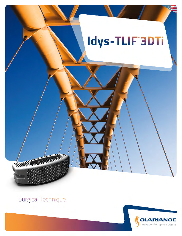 Idys-TLIF 3DTi by Clariance is a curved transforaminal lumbar interbody spacer made of 3D printed titanium. The self-distracting bullet-shaped nose facilitates insertion, and the anatomical shape conforms to the patient's vertebral endplates to enhance stability. The system utilizes a smart controlled pivoting system for optimal implant positioning. The 3D printed titanium implant has a rough surface that promotes strong primary integration and stability, while the biomimetic porous scaffold promotes optimal bone ingrowth.