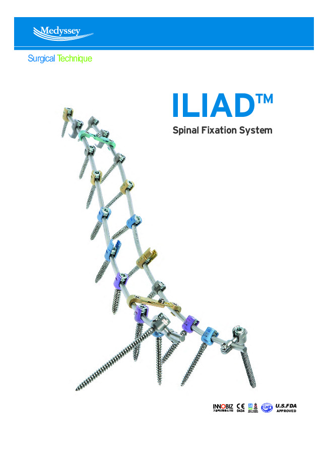 ILIAD by Medyssey is a thoracolumbar posterior spinal fixation system with a variety of screw options with heads that feature a dovetail locking system with linear slot mechanism. The dovetail thread design reduces the chance of cross threading, while the linear slot in the set screw compresses upon final tightening to increase holding forces and preventing screw back out. The screws are available in mono, poly, reduction mono, reduction poly, cannulated mono, and cannulated poly options, with a wide range of sizes. The rod options include straight, pre-bent, titanium alloy, and cobalt-chrome molybdenum alloy.