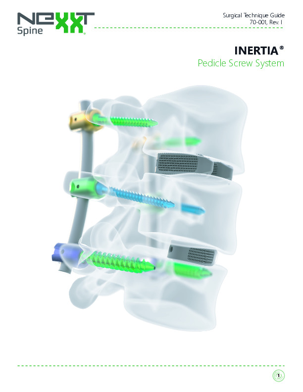 The Inertia Pedicle Screw System by Nexxt Spine is a complete thoracic-lumbar-pelvic fixation system for use in the standard open to complex deformity correction procedures. It features a wide array of screw options including reduction scres, iliac bolts, monoaxial screws, uniplanar screws and portico-cancellous screws. Features a click-in rod feature that clicks and holds rods in place.