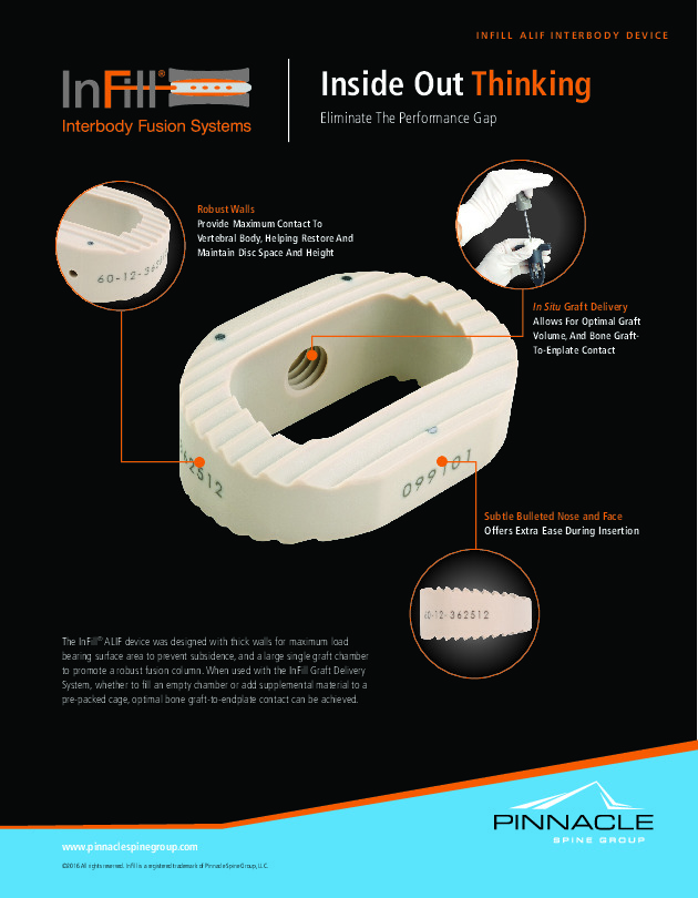 The InFill ALIF Spacer by Pinnacle Spine is a radiolucent PEEK spacer for use in the anterior lumbar interbody fusion procedure. The InFill system allows for post placement filling of the spacer via the graft delivery device.