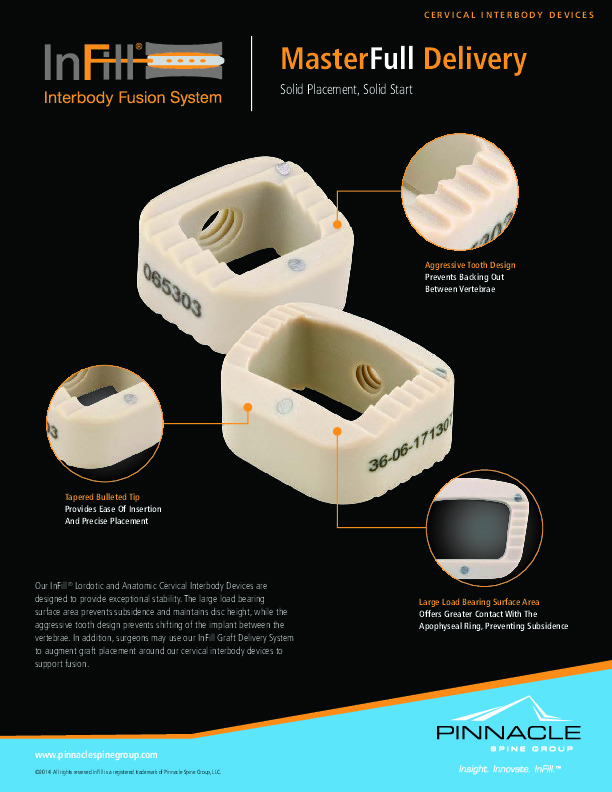 The InFill Cervical PEEK ACDF Spacer by Pinnable Spine Group is a radiolucent PEEK spacer for use in the ACDF procedure. It comes as anatomic and lordotic options