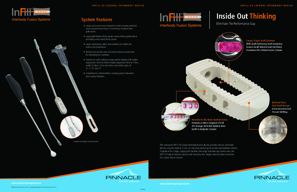 The InFill V2 PEEK lateral lumbar interbody Spacer by Pinnacle Spine Group is a PEEK interbody spacer inteded for implant via the direct lateral retroperitoneal approach. It features a radiolucent material with a variety of implant sizes and lordosis options and includes the proprietary InFill graft delivery to maximize amount of graft material into the spacer.