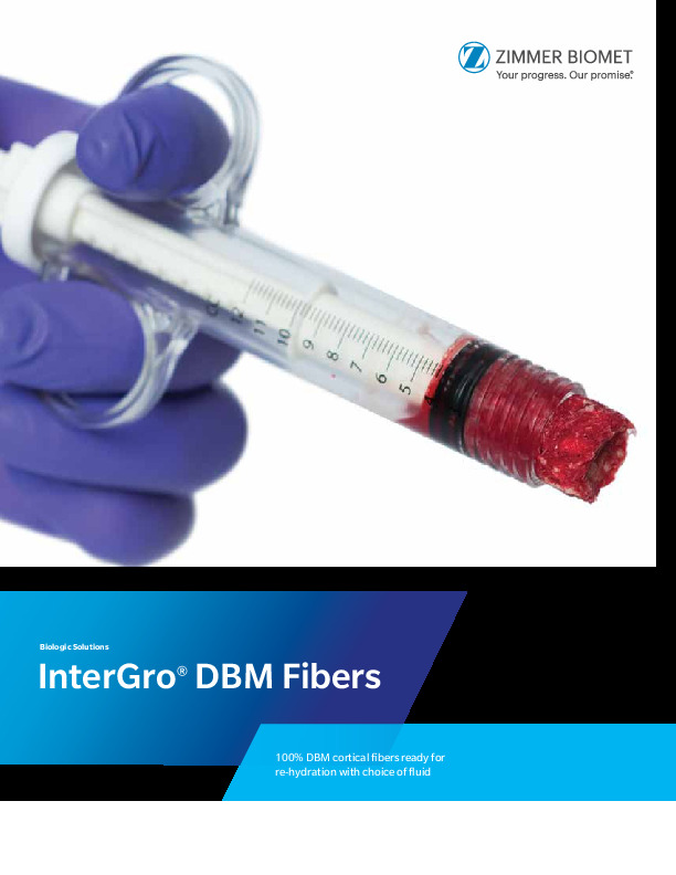 The InterGro DBM Fibers are dehydrated 100% cortical bone fibers that provide excellent osteoinductive and osteoconductive properties. product can be rehydrated with blood, BMA, or saline and are easily moldable