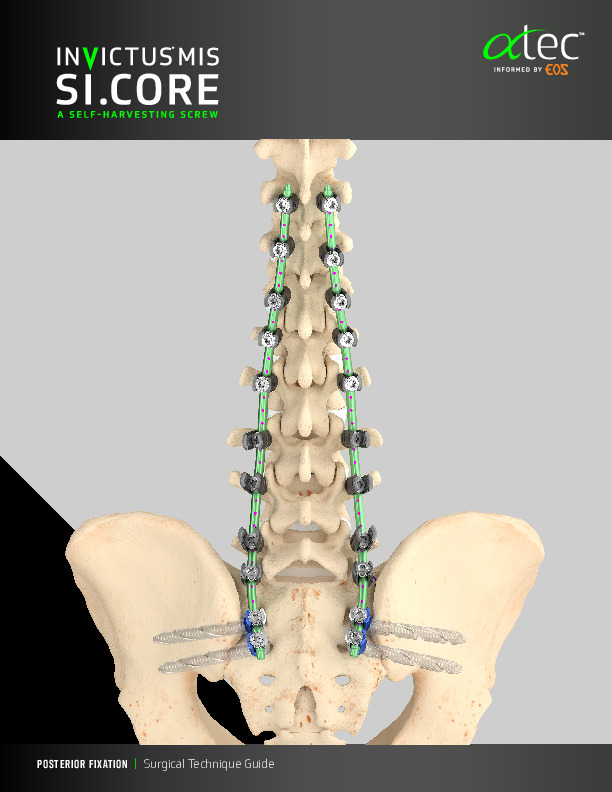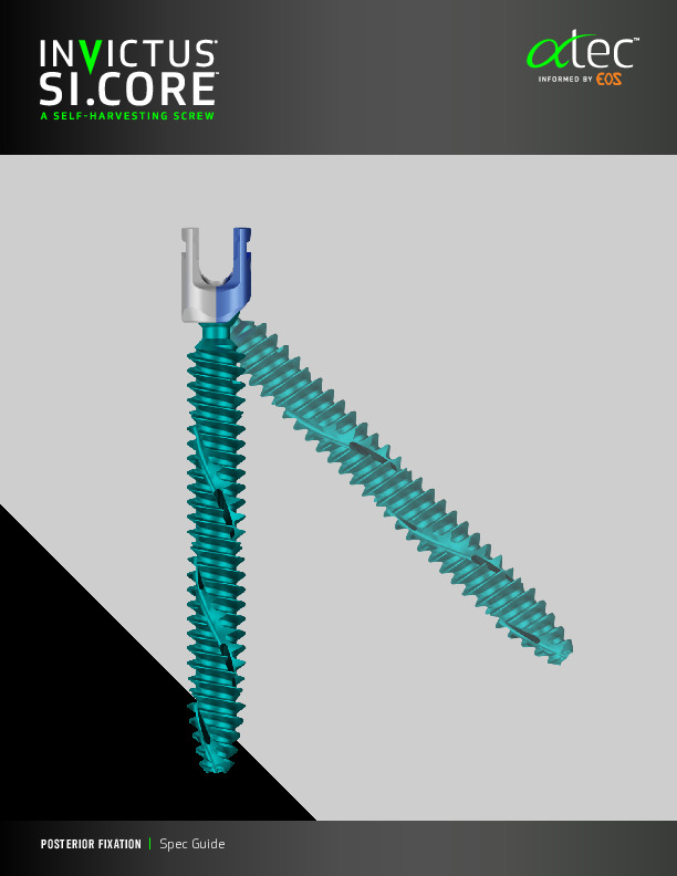 The Invictus SI.Core is a Sacro-iliac fixation bolt by ATec that has helical fenestrations to allow for harvest of autograft to be pulled into the center core of the screw to increase pelvic fixation. Compatible with S2-Alar-iliac screw or iliac bolts.