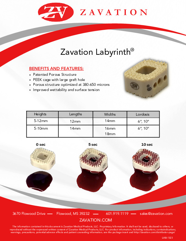 The Labyrinth ACDF Spacer by Zavation is a porous PEEK that wicks blood and blood product into the porous surface structure of the cage which is optimized at 380-650 microns. Suitable for use with the Varisync Anterior cervical plate