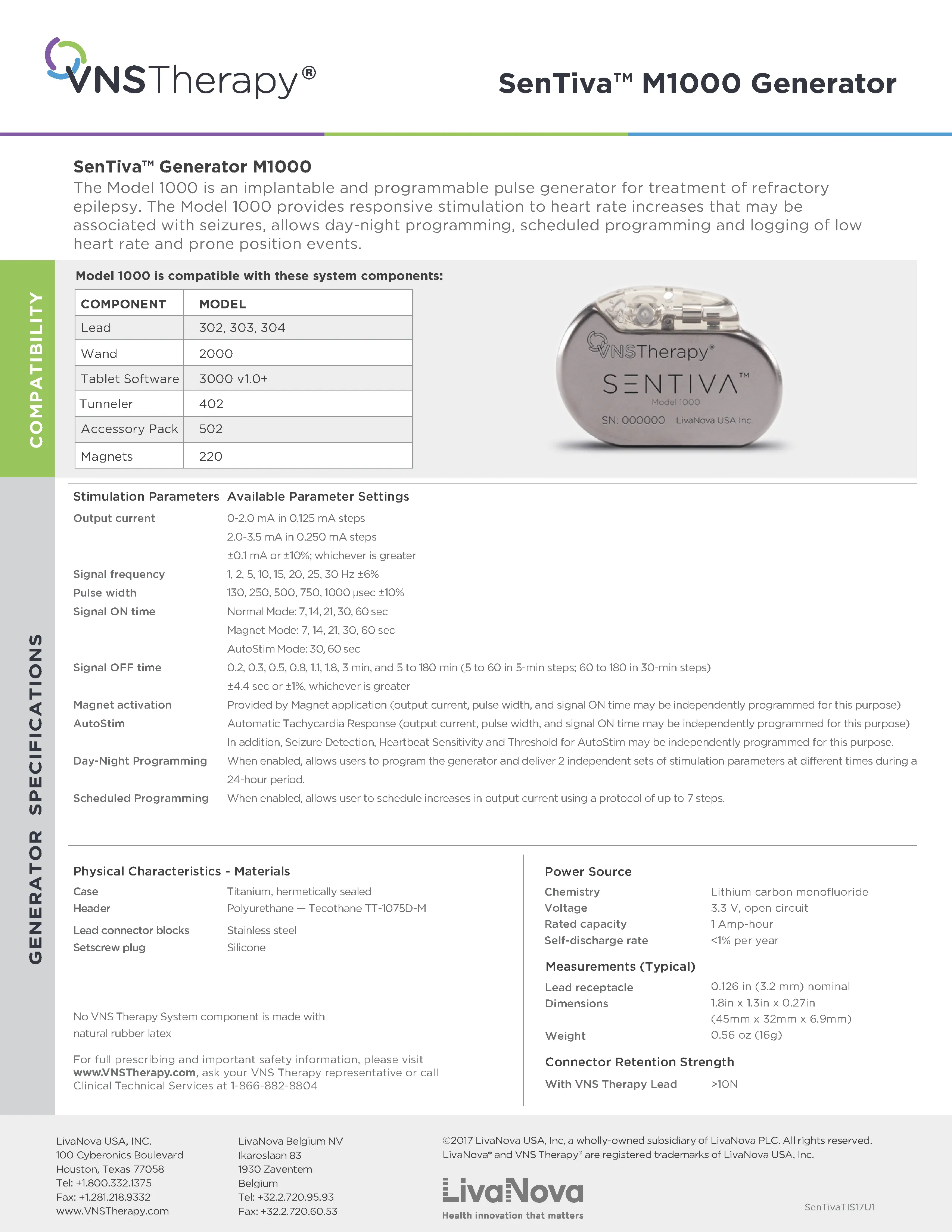 The LivaNova SenTiva M1000 vagal nerve stimulation generator is an implantable and programmable pulse generator for the treatment of refractory epilepsy/ The SenTiva M1000 comes as a single pin or dual pin generator. The small size makes is suitable for use in pediatric epilepsy cases. The SenTiva M1000 provides responsive stimulation to heart rate increases commonly associated with seizure, allows differential programming for day and night time as well as scheduled programming changes for ramp-up therapy.