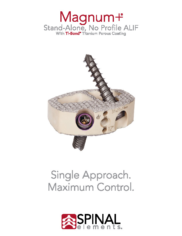 The Magnum+ Stand-Alone ALIF Spacer by Spinal Elements is a titanium coated PEEK interbody spacer using proprietary Ti-Bond surface treatment. Ti-Bond produces increased hydrophilic bonding with increased microstructure for increased surface area and bony adhesion. The spacer has integrated screw fixation with a locking ring to prevent screw backout