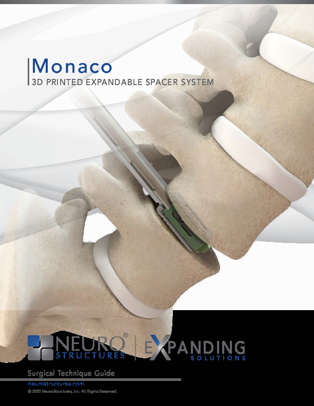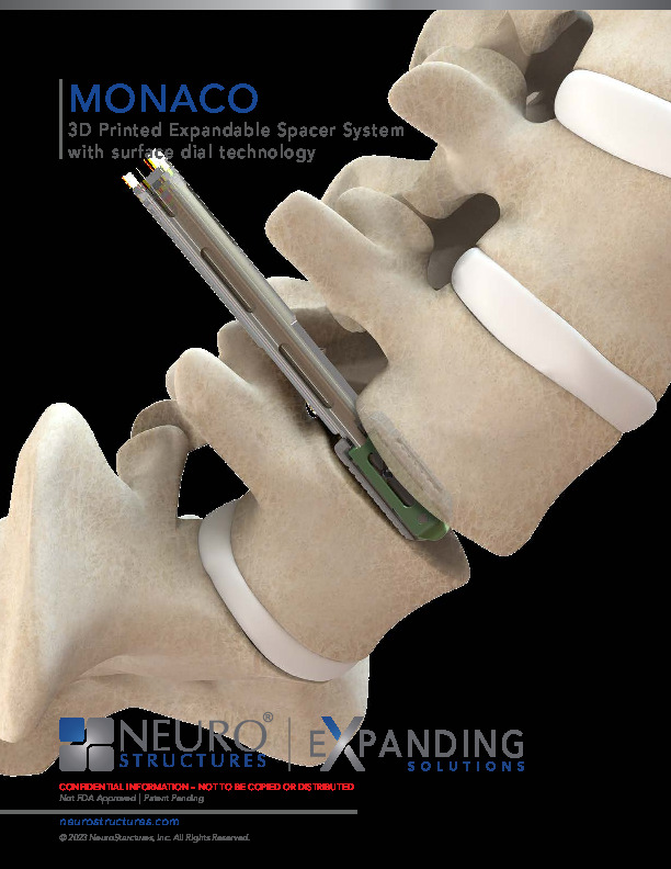 The Monaco Expandable Spacer System by NeuroStructures/NuGen is an expandable titanium alloy PLIF/TLIF interbody spacer with 3D printed textured titanium endplates to promote immediate mechanical fixation and development of bony ingrowth. It was created to minimize neural retraction and insertion force, while providing controlled parallel or angular expansion to restore foraminal and disc height.