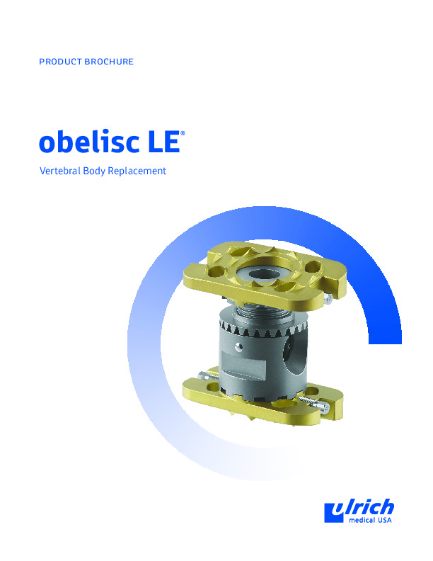 The obelisc LE vertebral body replacement device by Ulrich Medical USA is a titanium alloy expandable implant used for the surgical reconstruction of the thoracic and lumbar spine after vertebrectomy (T1-L5), via lateral approach. Gear driven stepless expansion in situ bridges defects and bony voids, with long rectangular end plates to assist with stability and prevent subsidence. Intended for use with supplemental spinal fixation.