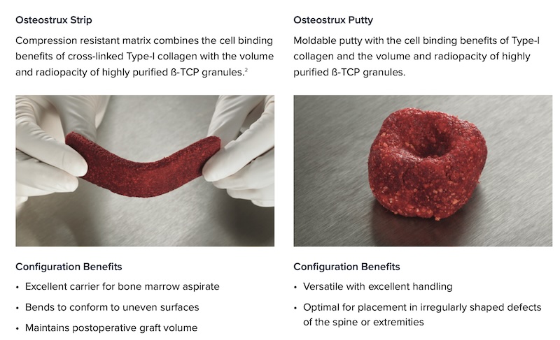 OsteoStrux Putty and Strips by SeaSpine-Orthofix are composed of ß-Tricalcium Phosphate (ß-TCP) and Type-I collagen. It is a highly absorptive synthetic osteoconductive scaffolding.