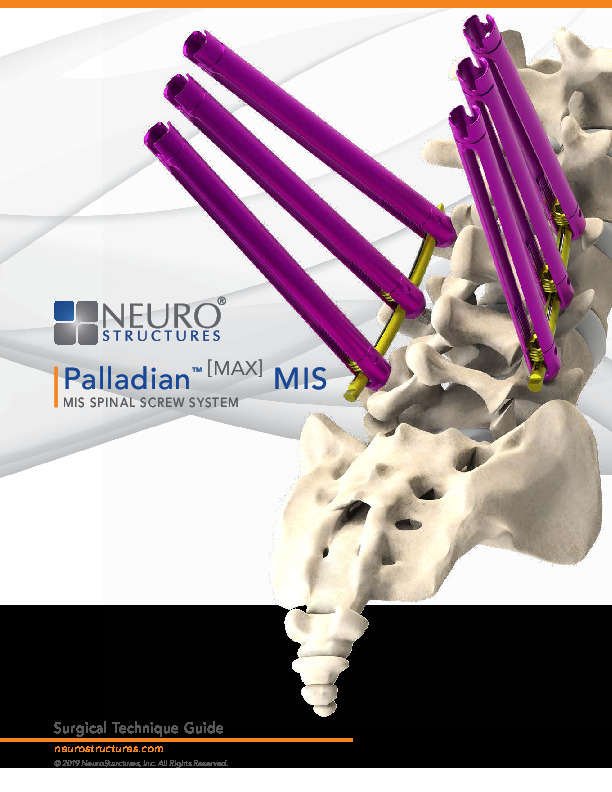 The Palladian[MAX] MIS by NeuroStructures/NuGen is a percutaneous spinal screw system designed to provide a quick and simple streamlined minimally invasive approach for posterior thoracolumbar fixation. It allows for percutaneous compression and distraction, as well as external and internal reduction options. The rod measuring gage and the wide range of pre-bend MIS rods enable effortless percutaneous multilevel rod placement.