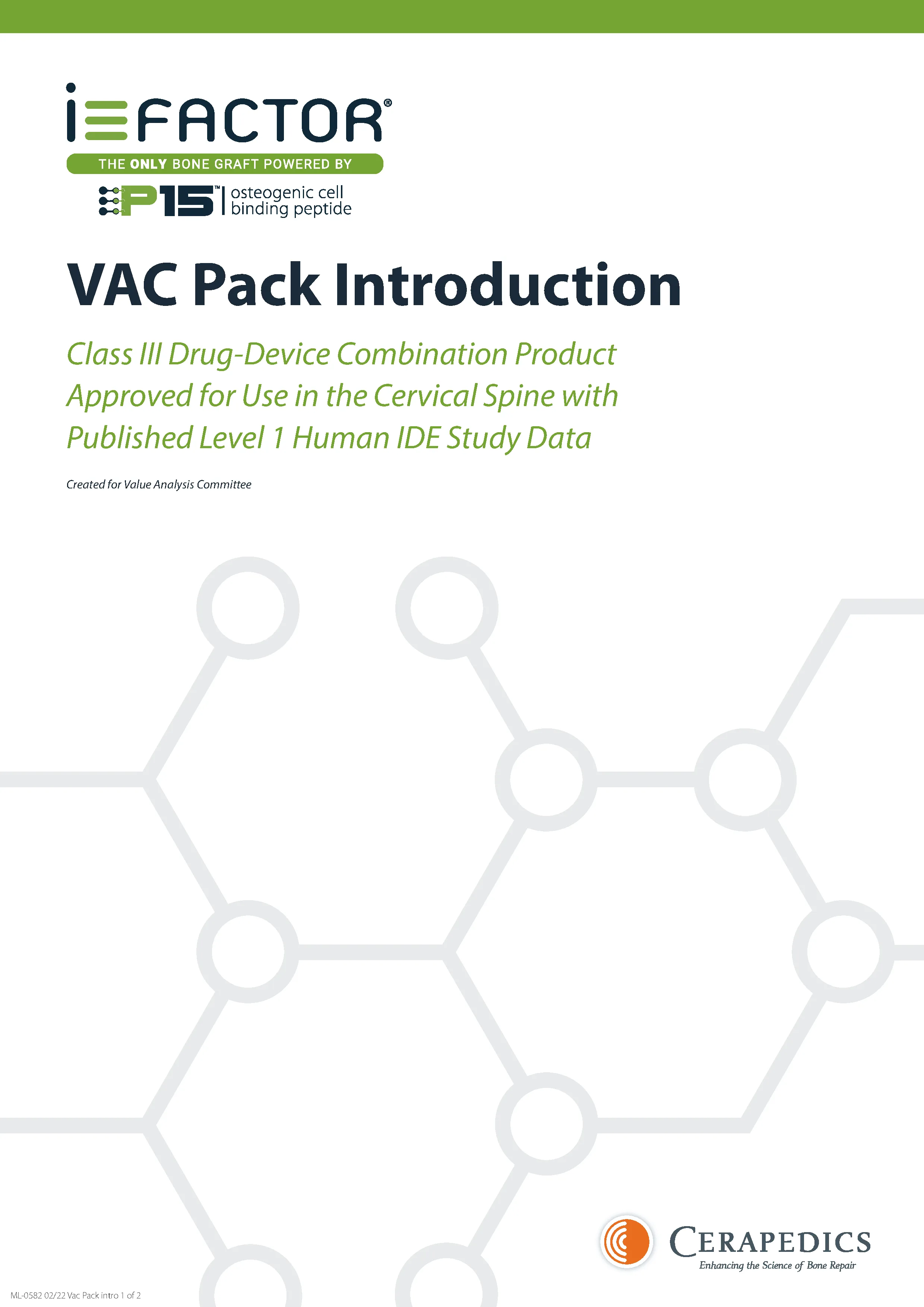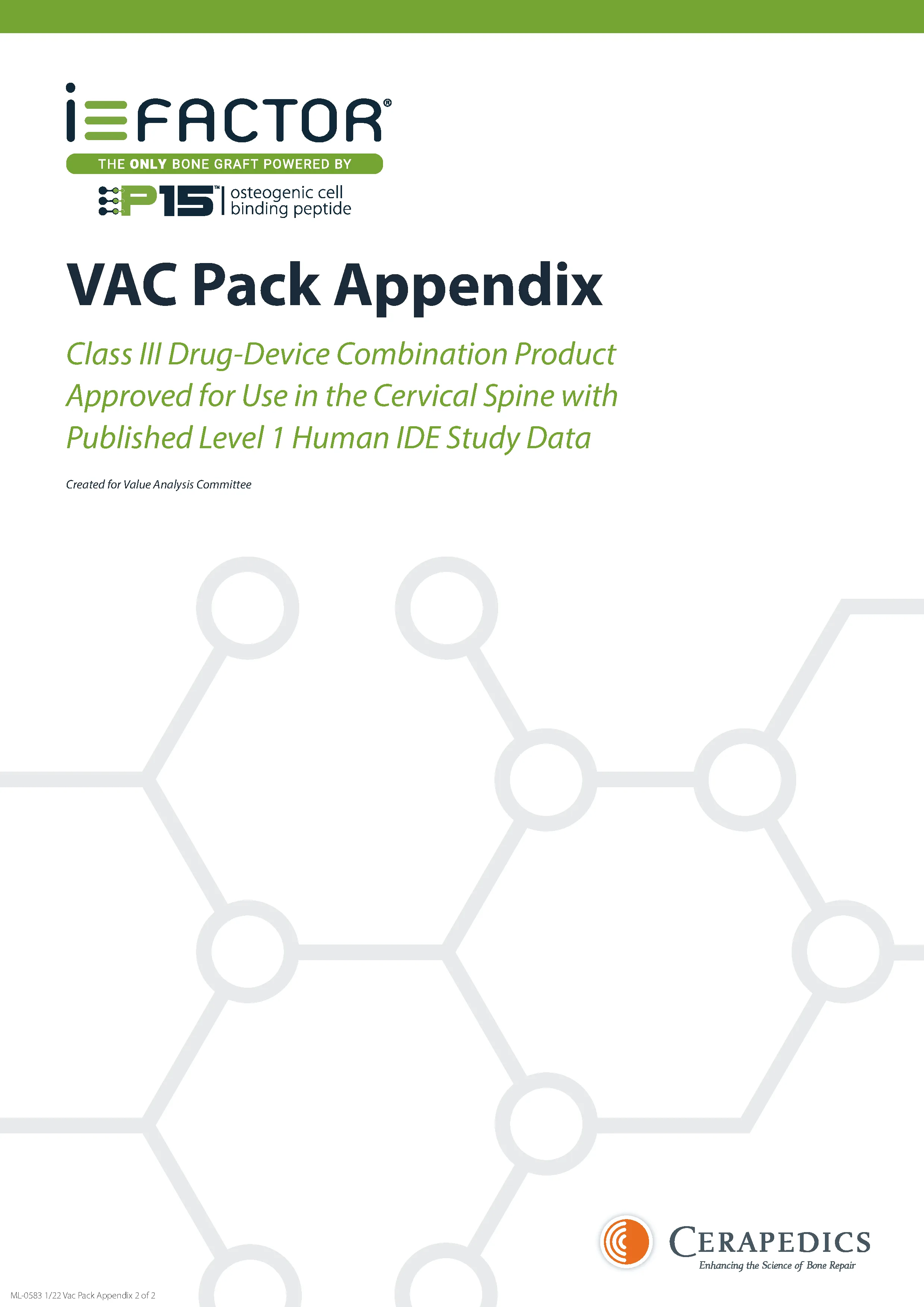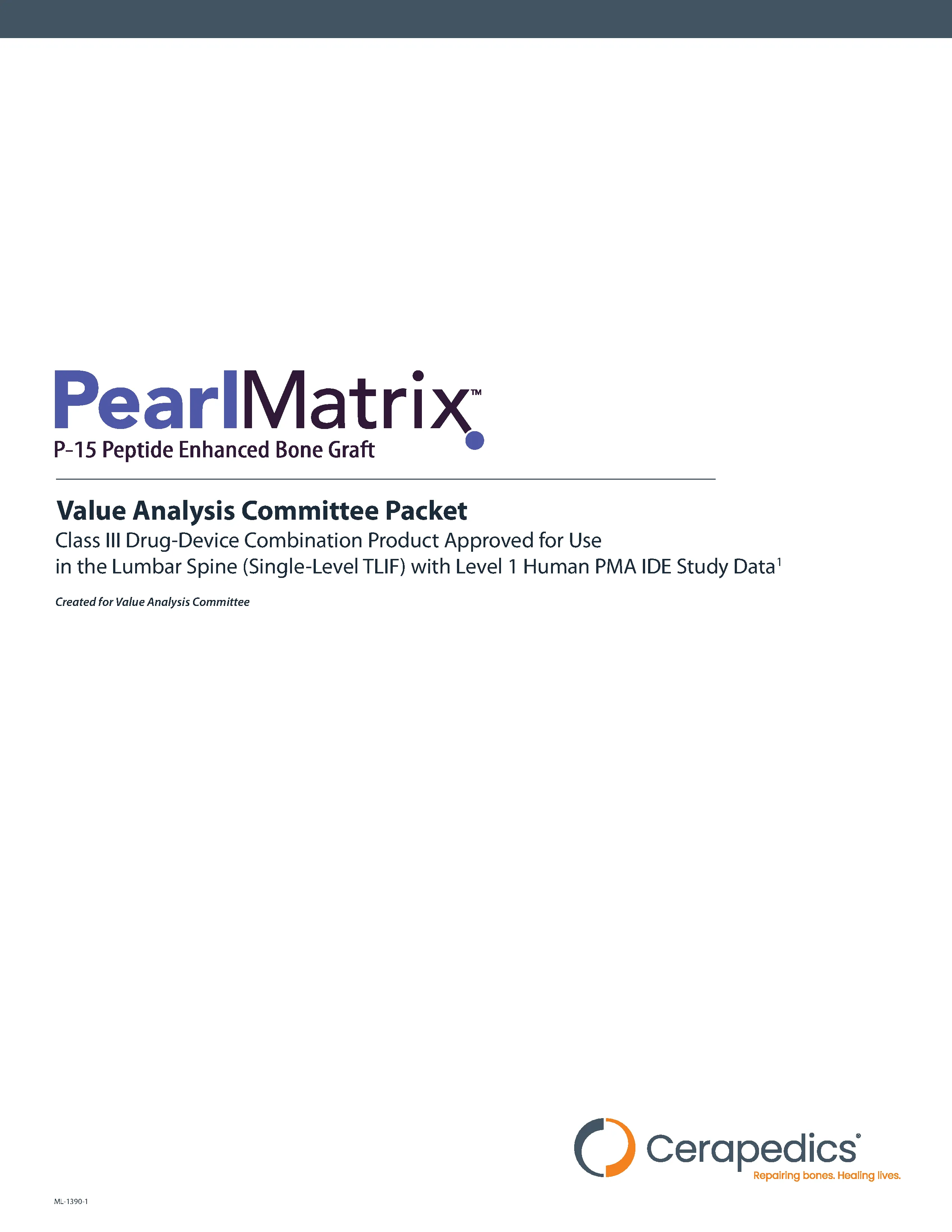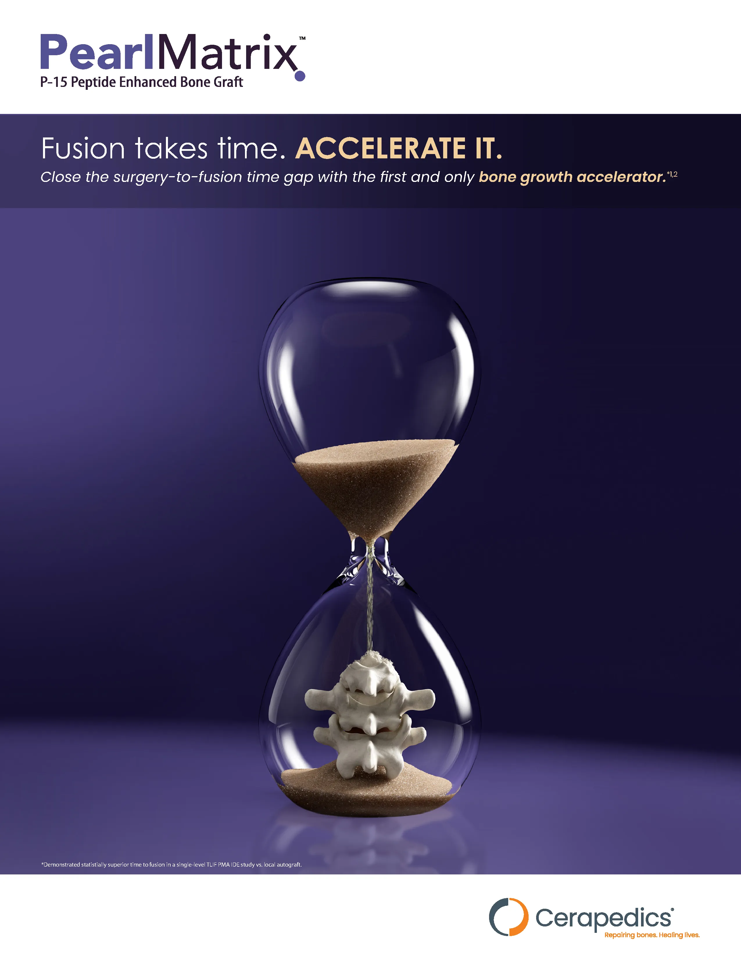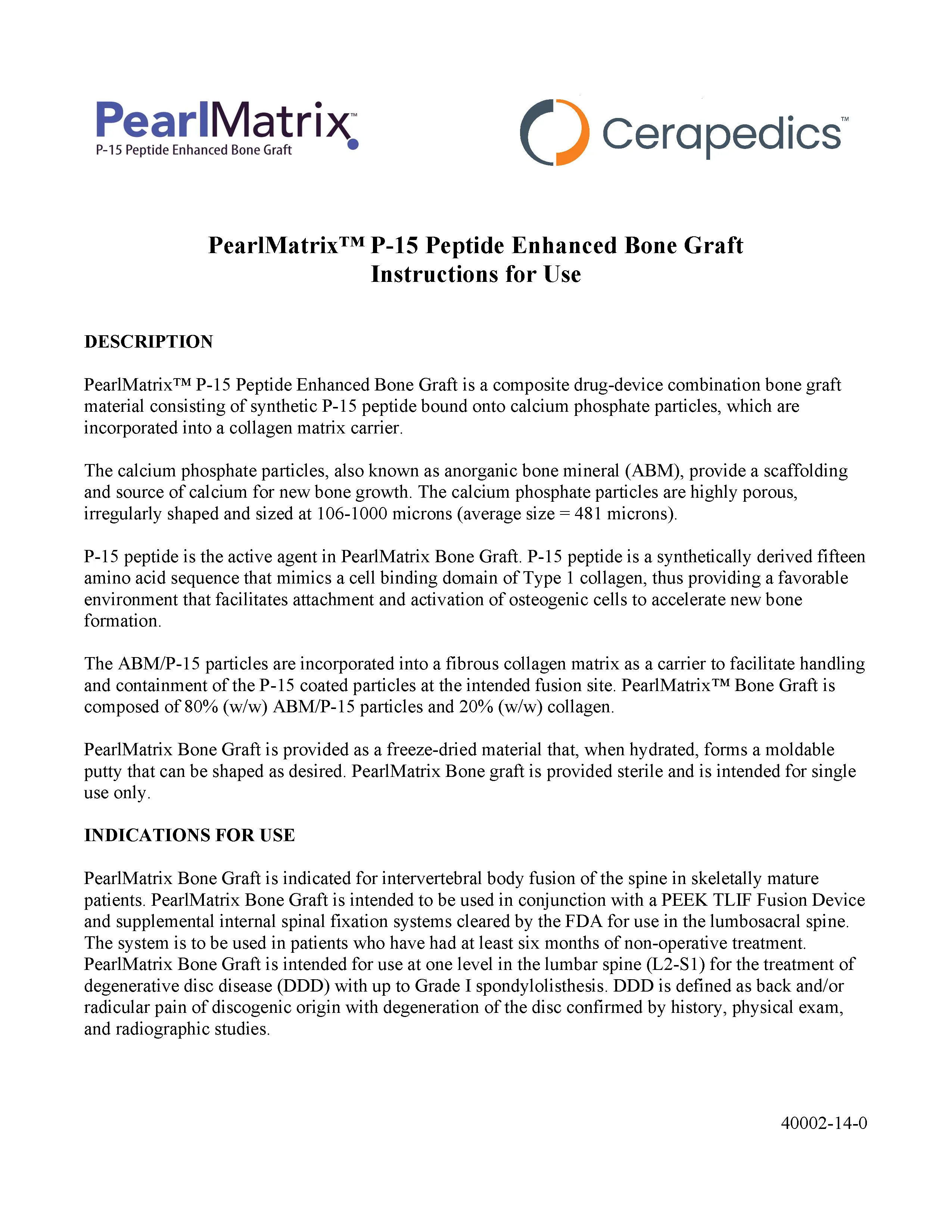 PearlMatric by Cerepedics is a novel P-15 Peptide with improved handling characteristics for use in spine fusion procedures. The underlying active component remains P-15 with Anorganic Bone material (Calcium Phophate particles, and bovine-derived Type I dermal collagen carrier (20% by weight). This come as freeze dried and rehydrates quickly to a moldable putty and is specifically designed for use in lumbar spine fusions. This is a 15-amino acid synthetic peptide that mimics Type I collagen and bound to calcium phophate. This peptide binds to and activate osteogenic cells which then activate and encourage the conversion of progenitor cells to osteoblasts which are stimulated to produce osteogenic growth factors. This signaling cascade produces the process of proliferation and new matrix deposition directly onto the anorganic bone material (calcium-phosphate scaffolding).