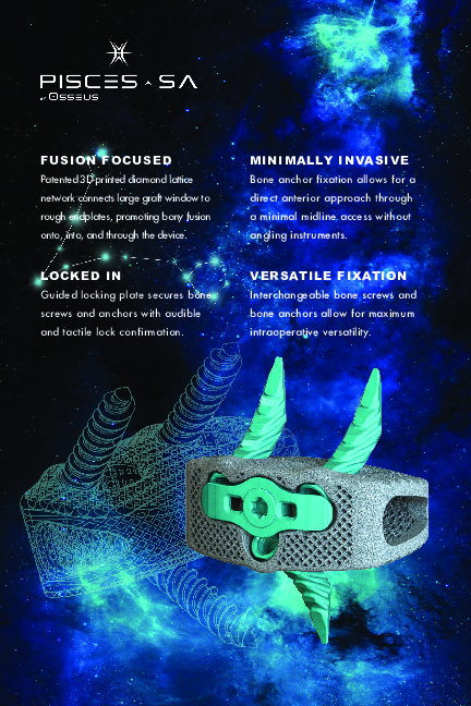 The PICES-SA by Osseus is a 3D printed titanium ALIF Spacer with integrated screws indicated for use in the stand alone fusion procedures of the anterior lumbar interbody fusion procedure. It features a large central graft window with roughed surfaces and high graft porosity for bony ingrowth. Fixation is accomplished via either screws or anchors.
