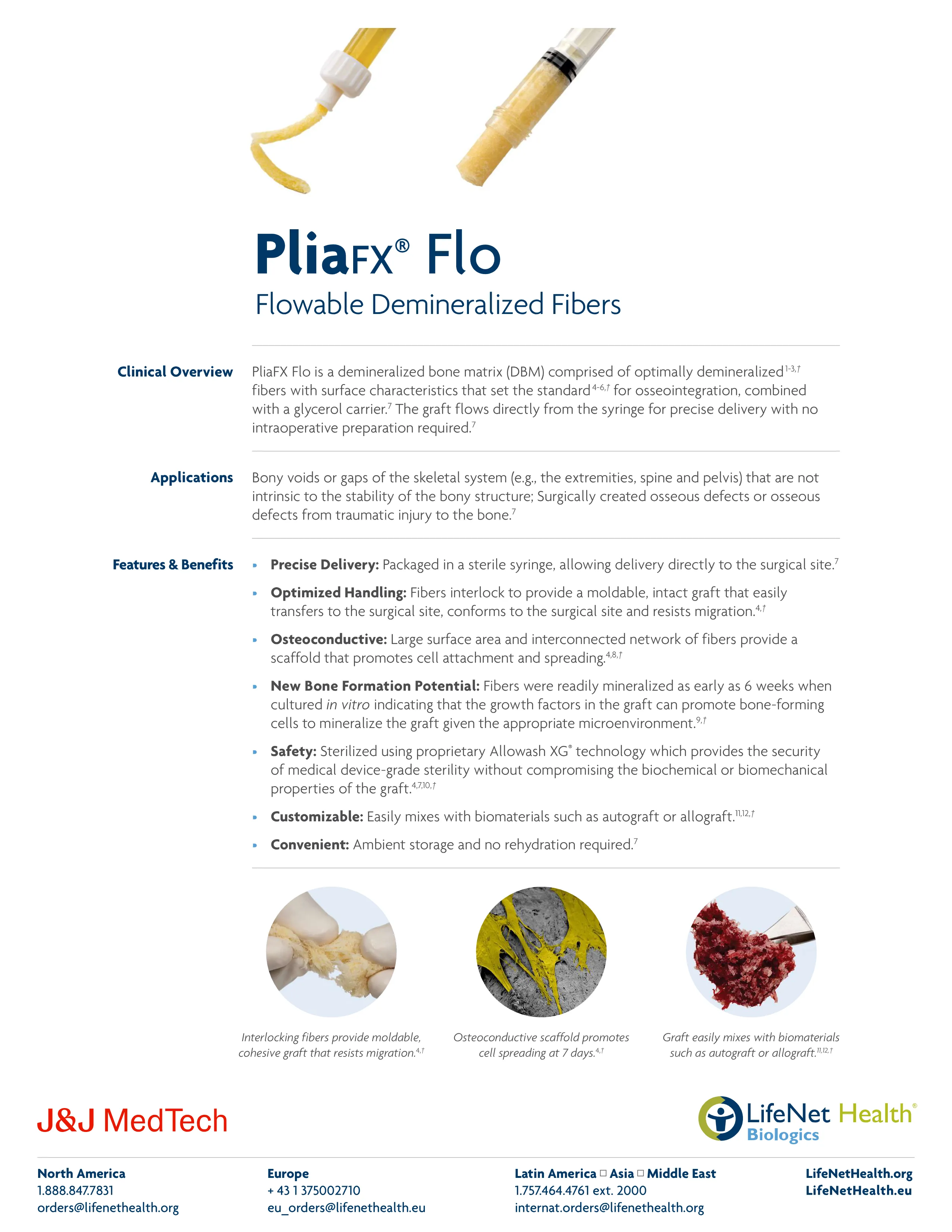 PliaFX Flo by LifeNet Health is a flowable allograft biologic produced by LifeNet Health that is composed of demineralized bone matrix (DBM) cortical fibers with a glycerol carrier that makes it flow easily from a syringe and easy handling and moldable without concern for washout of graft.