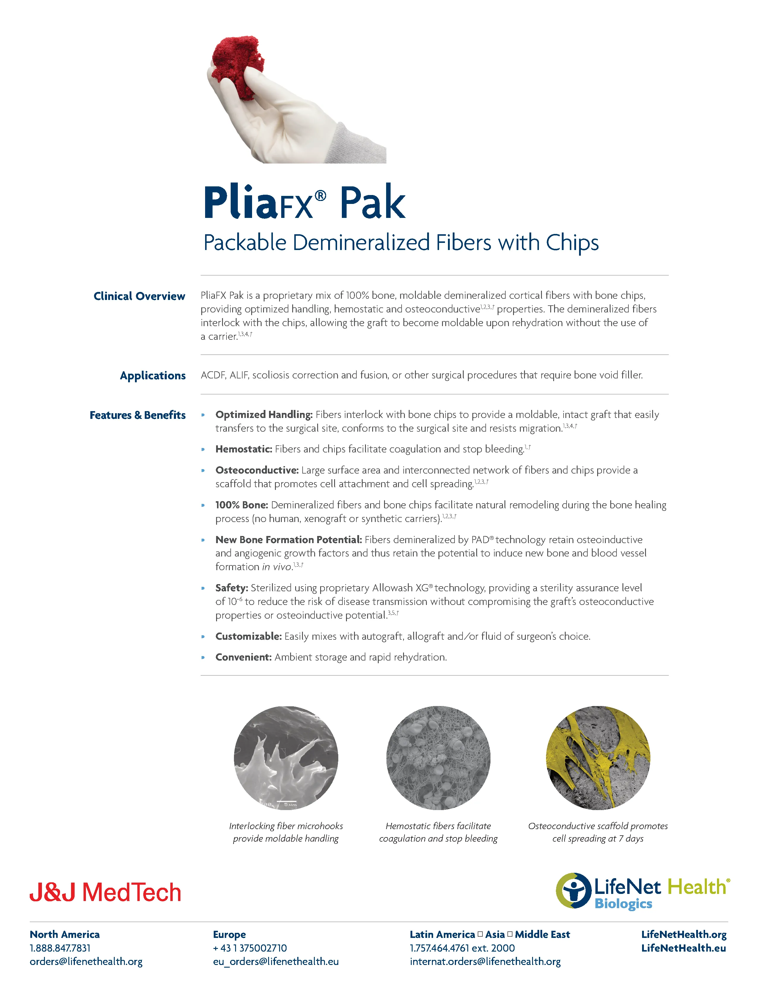 PliaFX Pak by LifeNet Health is a 100% bone mix composed of demineralized cortical bone fibers and bone chips. The mixtures is dehydrated freeze-dried and shelf stable packaging allows it to be rehydrated quickly and is readily moldable without the use of a carrier. It is produced by LifeNet Health and is also distributed by J&J MedTech.