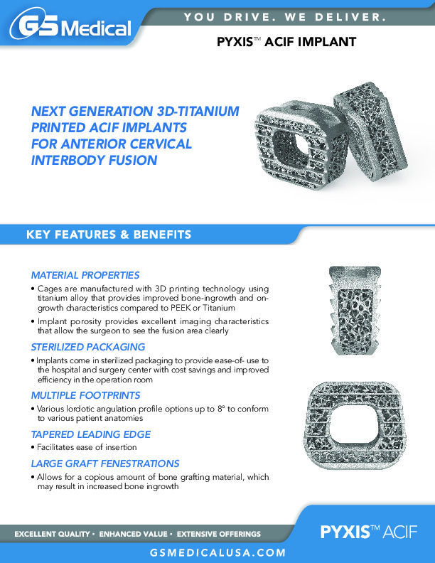The Pyxis ACIF Implant by GS Medical is a 3D printed porous titanium ACDF spacer for use in the anterior cervical discectomy and fusion procedure. It features a trabecular internal architecture to allow for bony ingrowth.