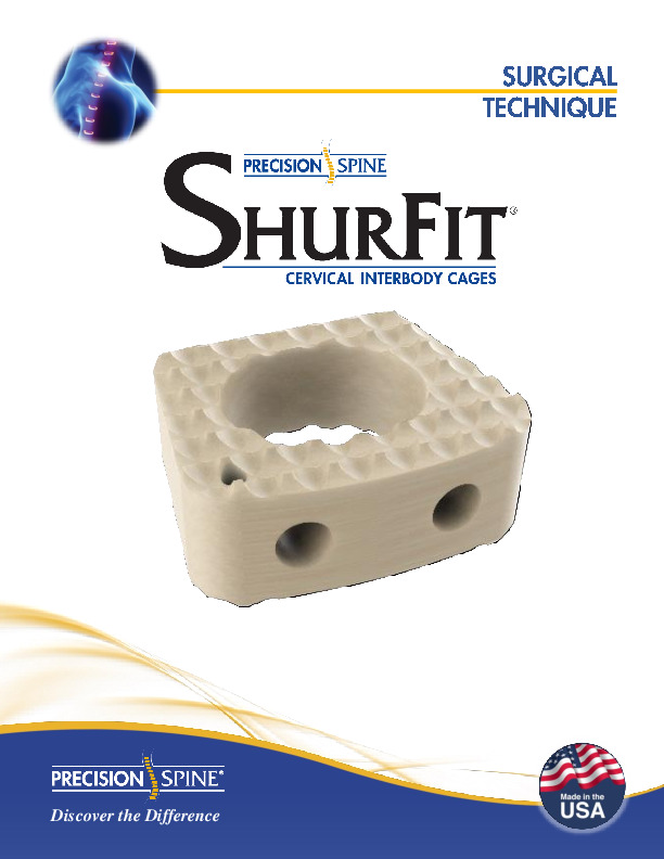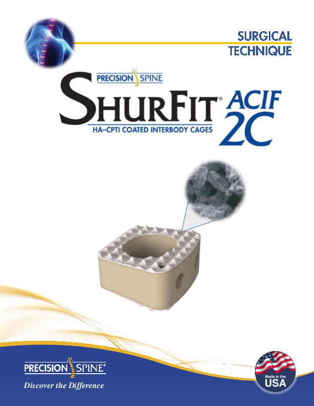 The ShurFit PEEK and ShurFit ACIF 2C by Precision Spine are PEEK interbody spacers for use in the ACDF procedure and come in standard PEEK as well as the 2C which comes with a dual layer of Plasma-sprayed Titanium coating and hydroxyapatite coating as well to improve osseointegration. This dual coating allows for increased visualization with the PEEK body and allows for increased bony integration due to the roughness of the Ti plasma spray coating.