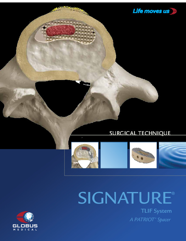 The SIGNATURE TLIF spacer is a MIS designed TLIF static cage that has a narrow inserted that allows for controlled placement of the cage via small openings. The cage comes in PEEK, Titanium plasma sprayed PEEK, and Titanium allow.