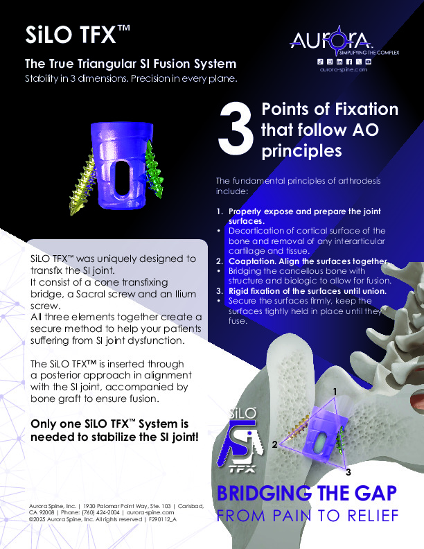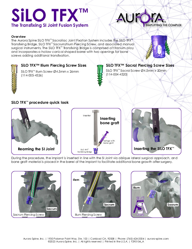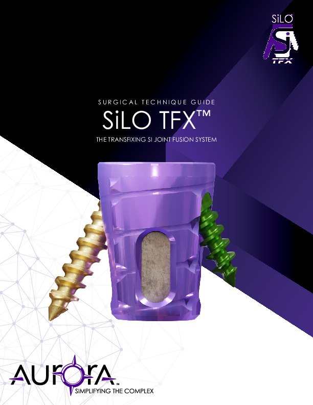 The SiLO TFX Sacroiliac joint transfixing bridge by Aurora Spine is a titanium conical shaped barrell with lateral graft fenestrations and features two fixation screws to the iliac wing and the sacrum.
