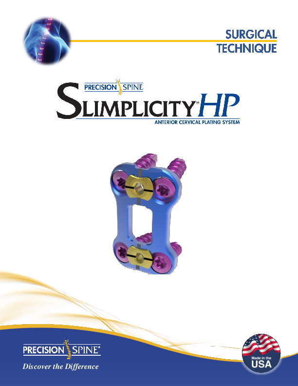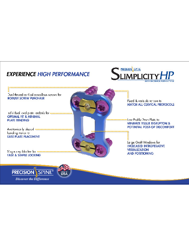 The Simplicity HP Anterior Cervical Plate by Precision Spine is a stand alone plate with high angulation of screws at the superior and inferior end of the plate. The plate features a locking screw cam to prevent back out and is available in 1 to 4 level plates