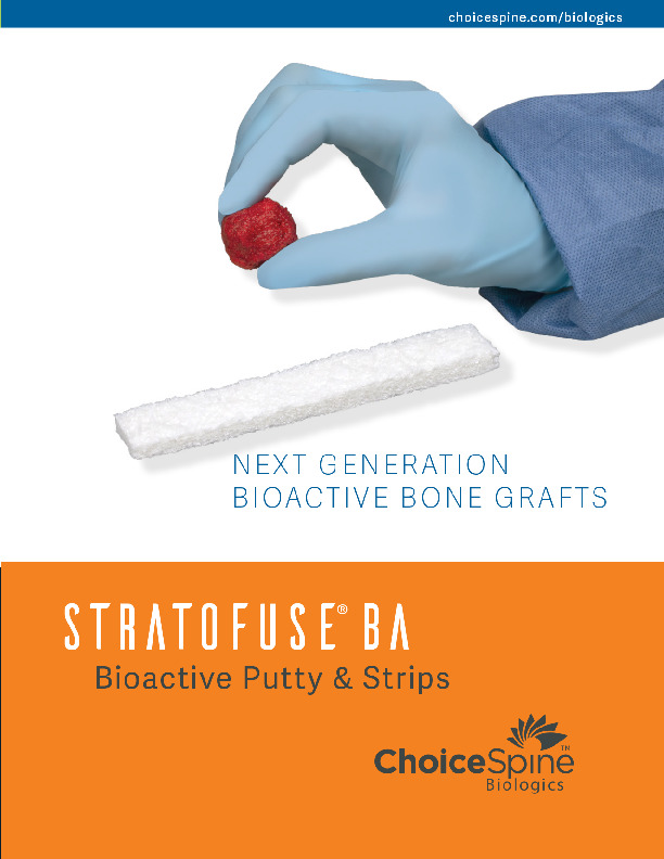 The STRATOFUSE BA Bioactive Glass Putty and Strips by Choice Spine is a synthetic biologic composed of Carbonate Apatite (50%), Bioactive Glass (30%), Type I collagen (20%).