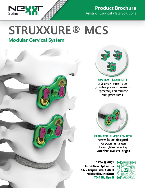 The STRUXXURE MCS (Modular Cervical System) by Nexxt Spine is a modular anterior cervical plating system that can be used alone as a low profile plate or assembled prior to implantation as a conjoined construct. STRUXXURE MCS is compatible with Nexxt MATRIXX cervical interbody or PEEK interbody.