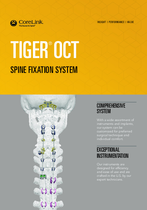 The Tiger OCT system by Zavation is an Occipital-cervical-thoracic fusion system designed to be compatible with all Tiger pedicle screw fixation systems. It features occipital plates in 3 sizes, biased angle and traditional poly-axial screws with up to 45 degree angulation.