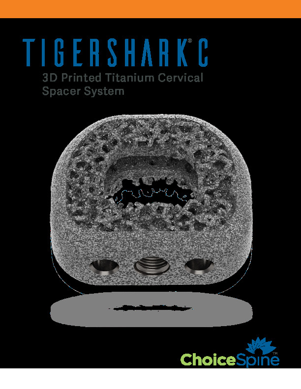 The TigerShark C by Choice Spine is a 3D printed titanium ACDF spacer utilizing Choice Spines proprietary porous trabecular metal technology. The spacer has a large central window and requires supplemental fixation with several options.